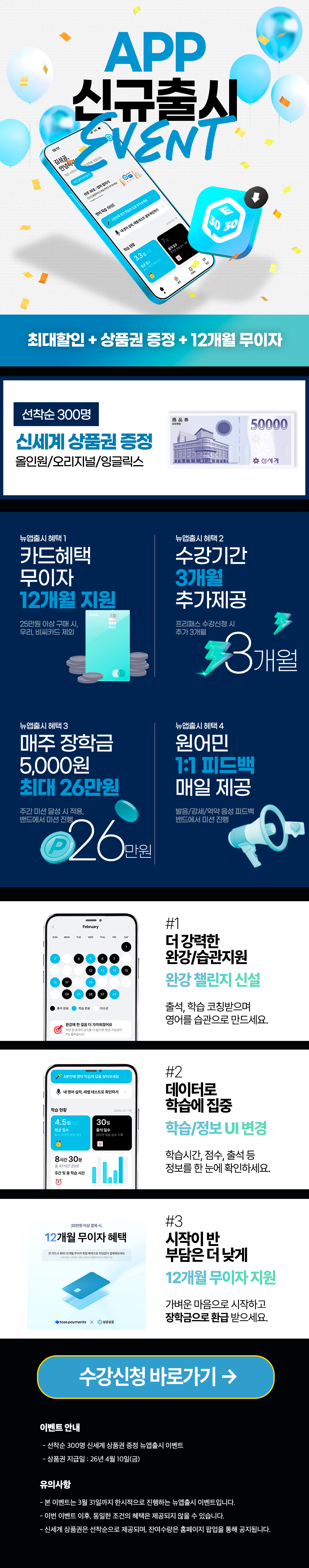 [뉴앱출시 기념] 역대 최대 혜택! | 최대 69% 할인, 장학금 26만원, 수강 3개월, 5만원 상품권, 12개월 무이자 할부!