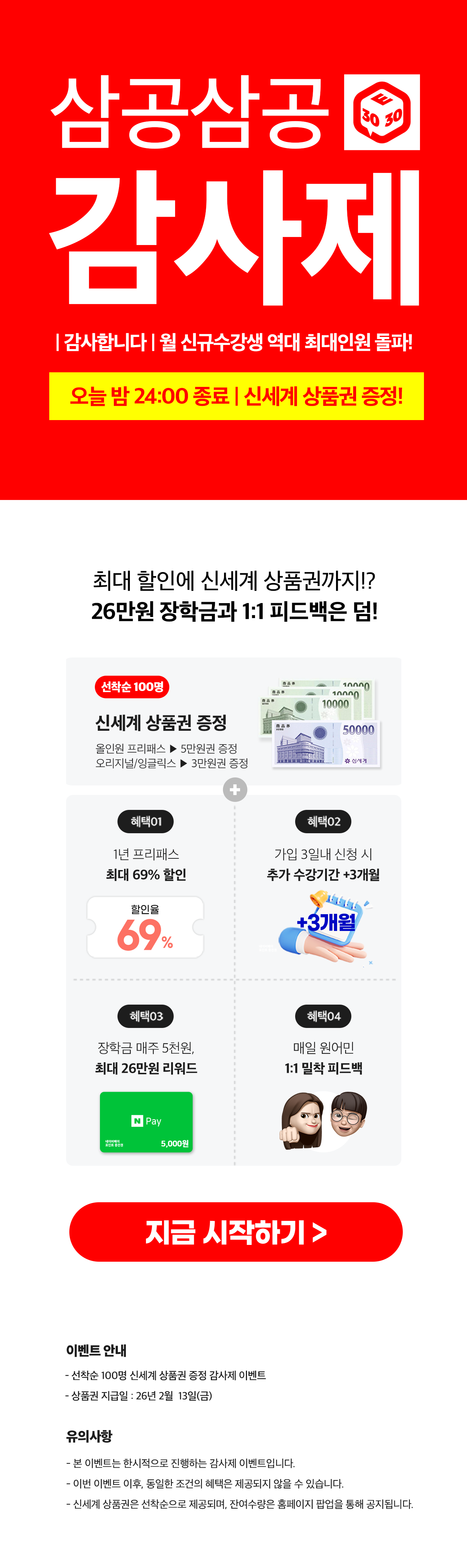 [오늘 종료] 감사제, 역대 최대 혜택! | 1년 무제한 69% 할인 + 장학금 26만원 + 수강 3개월 + 신세계 5만원 상품권!